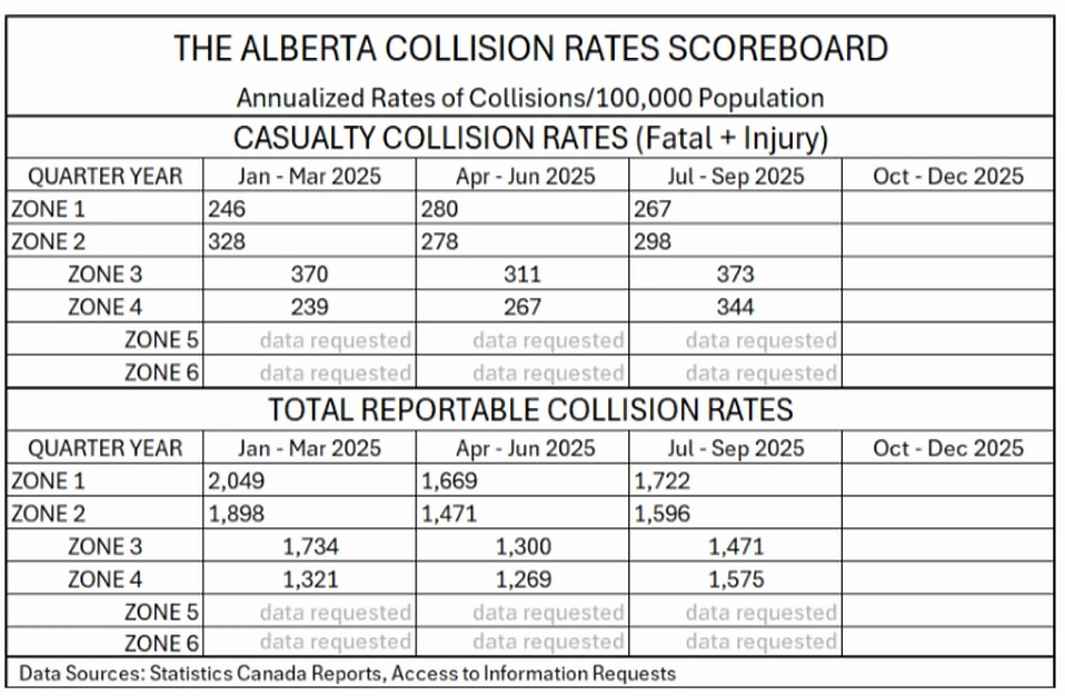 The Scoreboard provides collision rates for the six driver zones of Alberta: